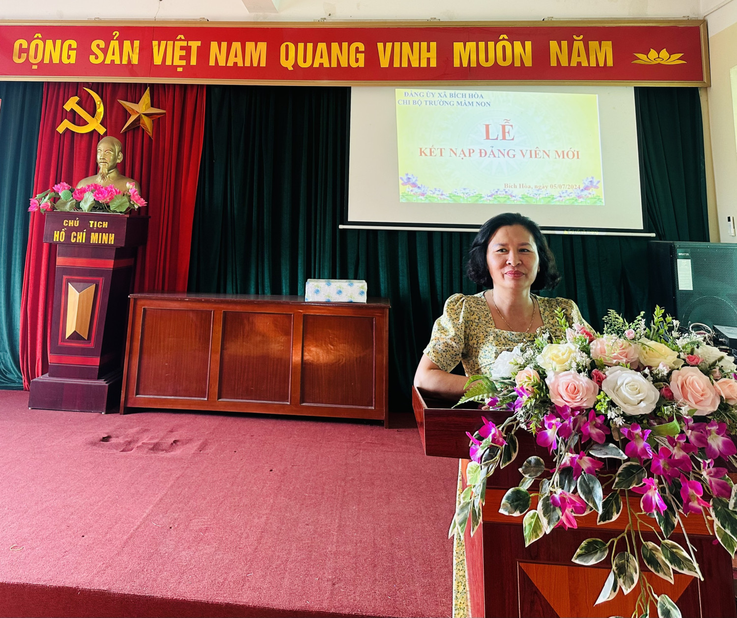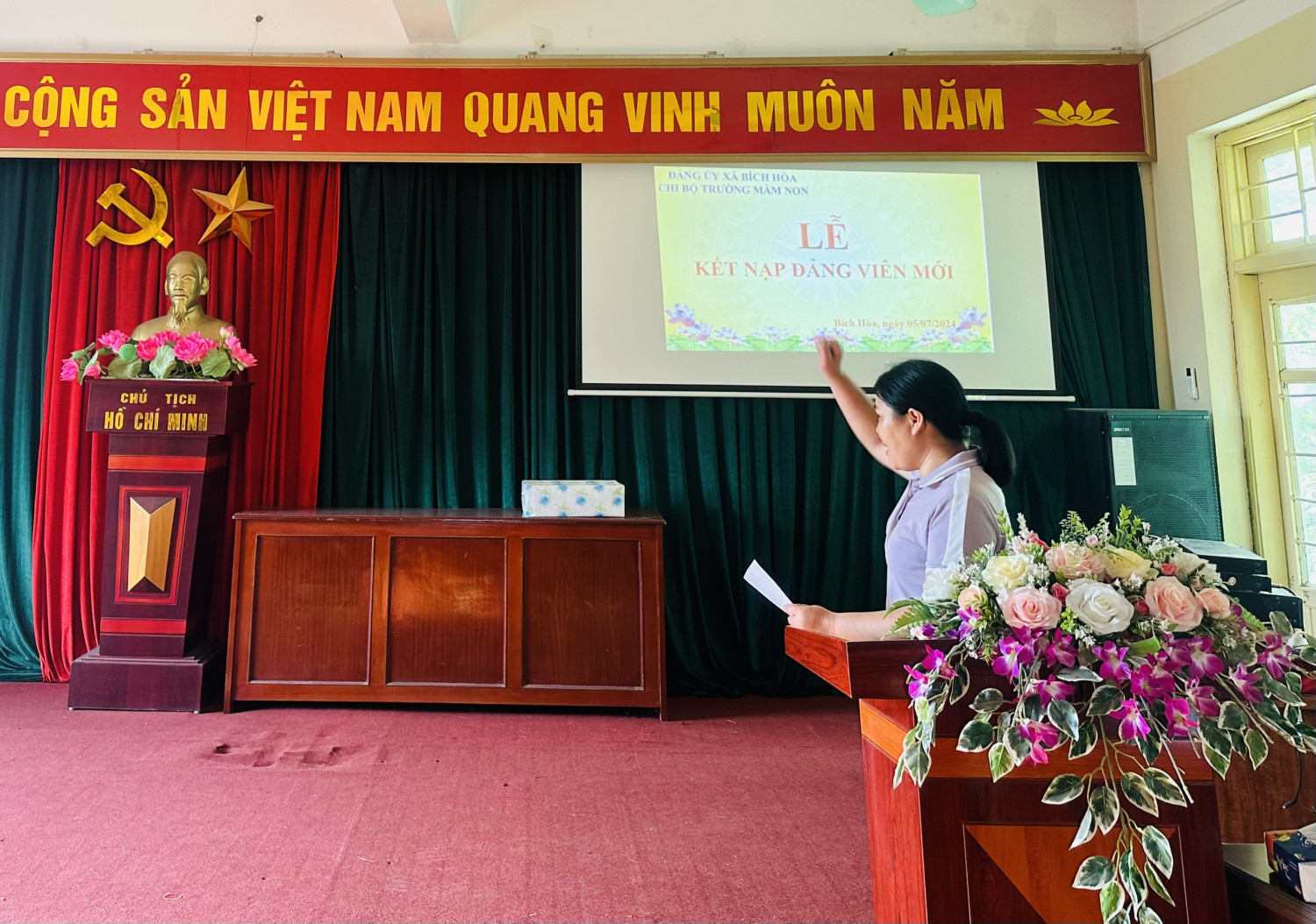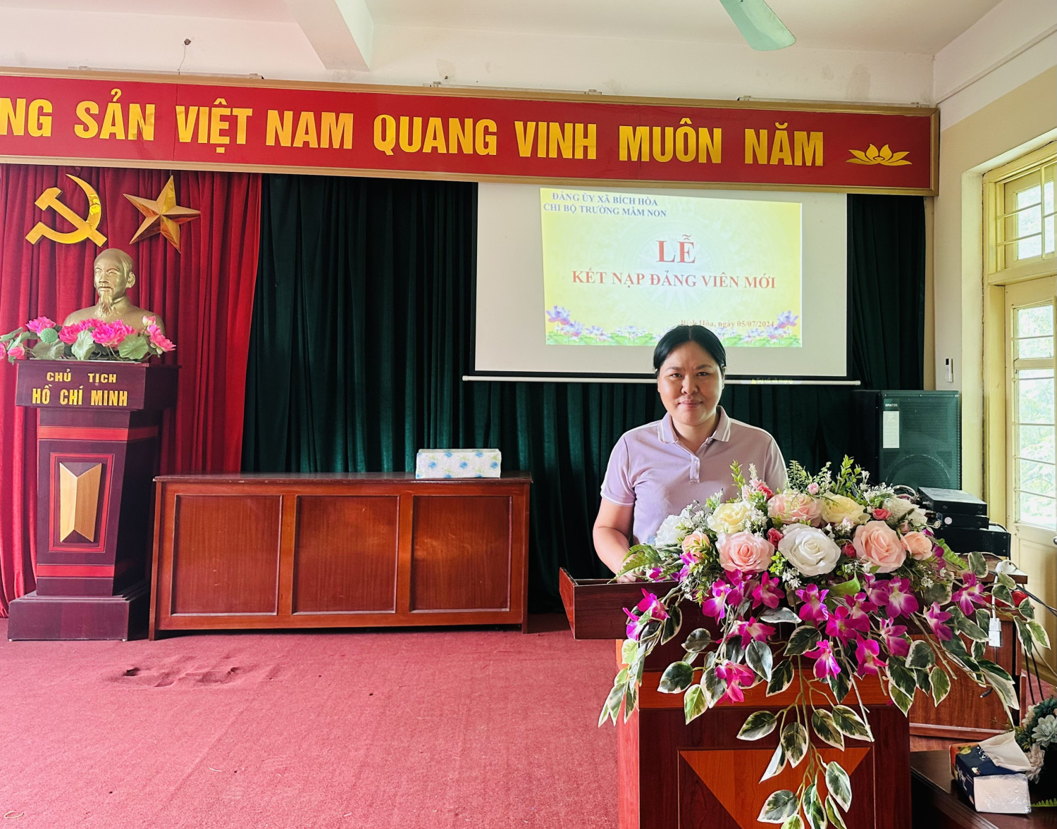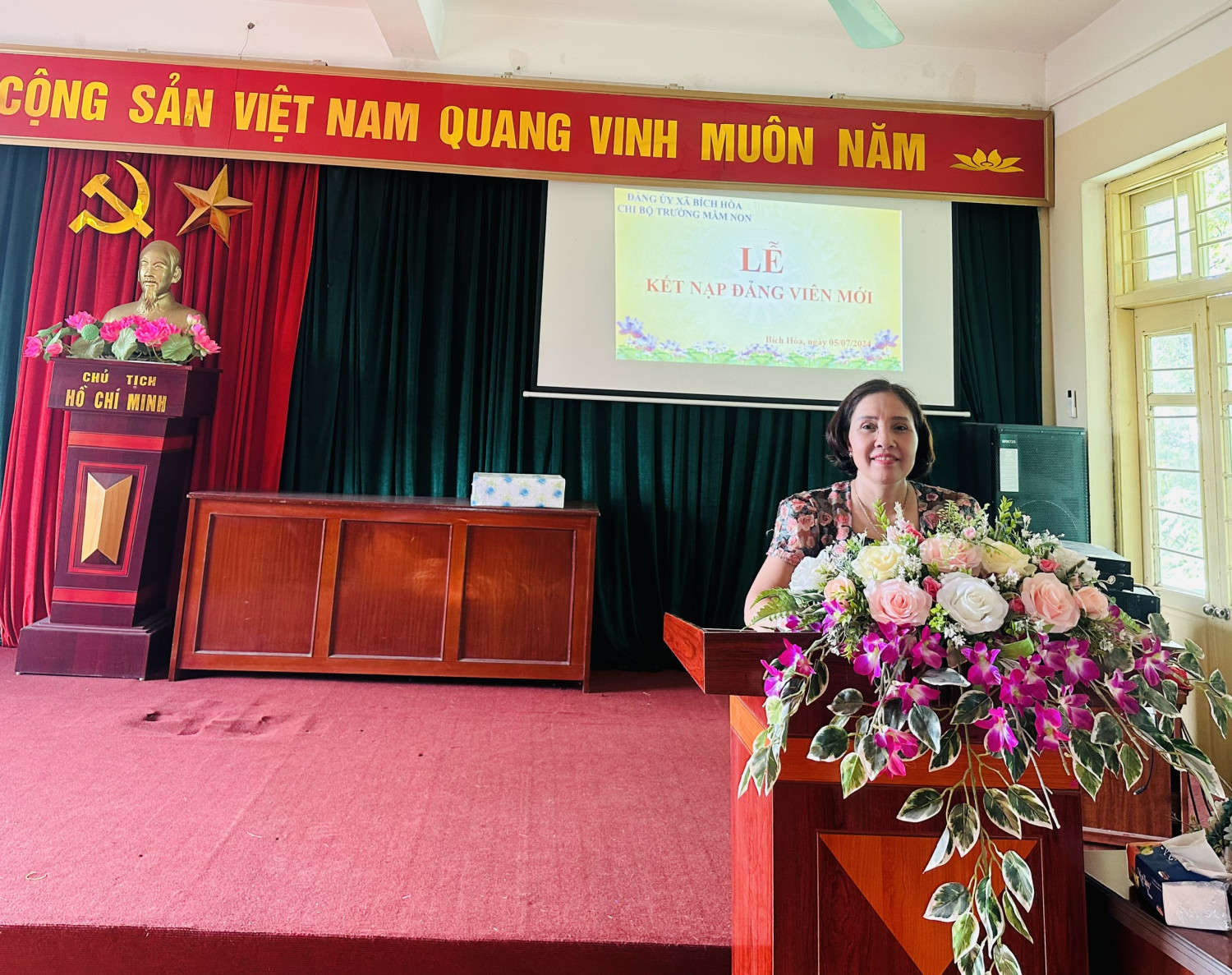 Ngày 5/6/2024, tại phòng họp trường mầm non Bích Hoà diễn ra buổi lễ "Kết nạp Đảng viên mới" cho quần chúng Tào Thị Hảo. Buổi lễ diễn ra trang nghiêm với sự góp mặt của ban Chi Bộ và các Đảng viên tại chi bộ trường mầm non.